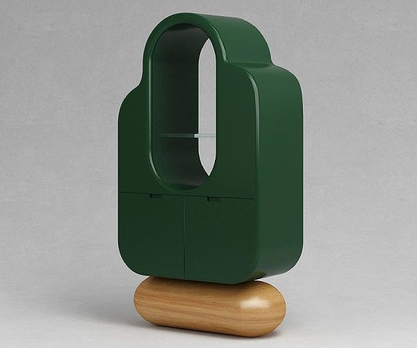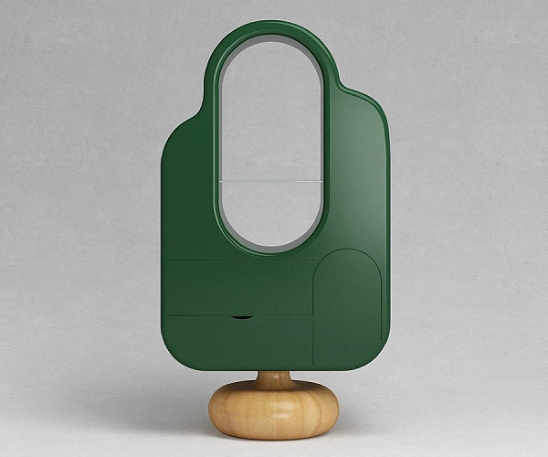 High-gloss lacquer body in forest green. Solid oak base. Interior glass shelf. Customisable lacquer colour on request.