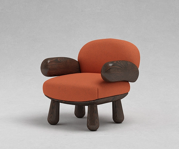 A rounded upholstered seat and back rest within a sculpted wooden frame. Solid cylindrical arms extend forward, echoing the grounded legs below. Compact in scale yet weighty in presence.