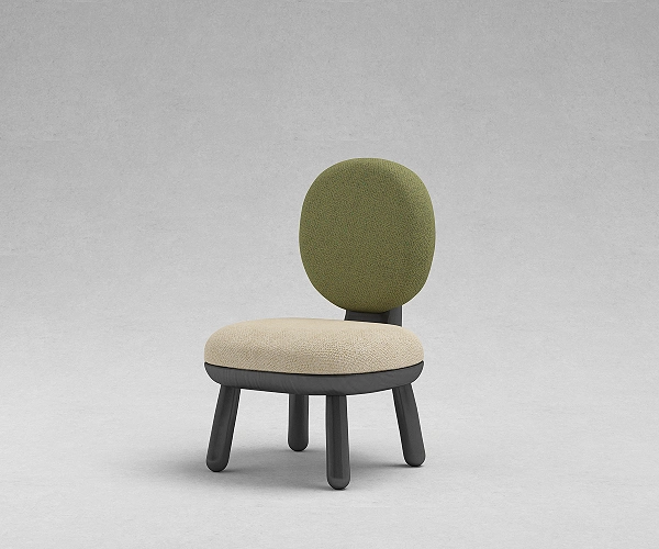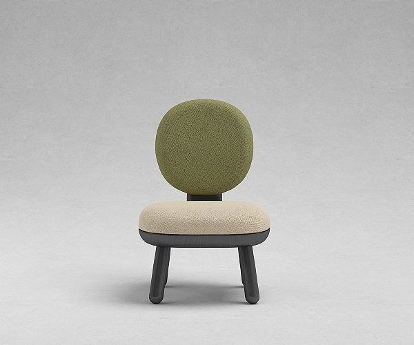 A circular upholstered back rises from a rounded seat set within a solid wood frame. Four angled cylindrical legs support the form with quiet stability. Compact, balanced, and clearly defined in silhouette.