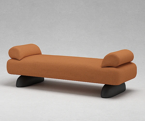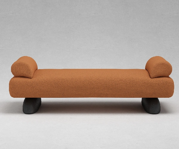 A long upholstered form, framed at either end by cylindrical bolsters. The seat rests on two sculpted bases, creating a clear dialogue between softness and weight. Balanced in proportion, generous in length, composed in silhouette.