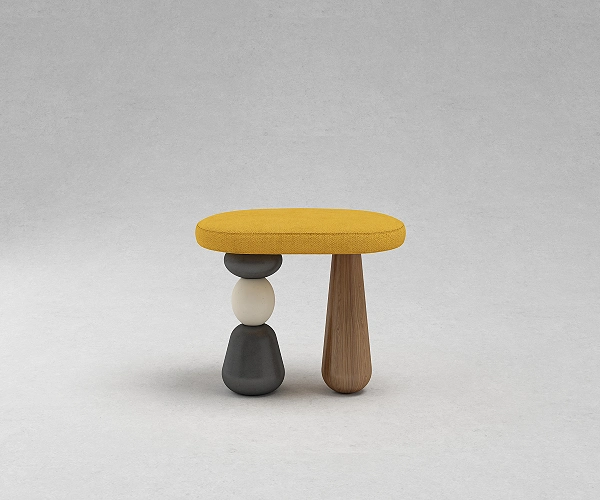 A circular top rests on two contrasting supports — one a stacked composition of rounded forms, the other a single tapered wooden leg. The balance between weight and lightness defines the piece. Clear in silhouette, deliberate in proportion.